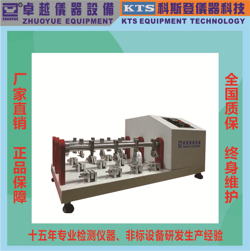 本機適用於橡膠製品﹑鞋底﹑PU﹑PVC﹑TPR發泡等材料之耐折試驗,试片经连续之弯折疲劳后检视其受损及龟裂程度。本儀器之設計符合ASTM-D4482-85標準要。