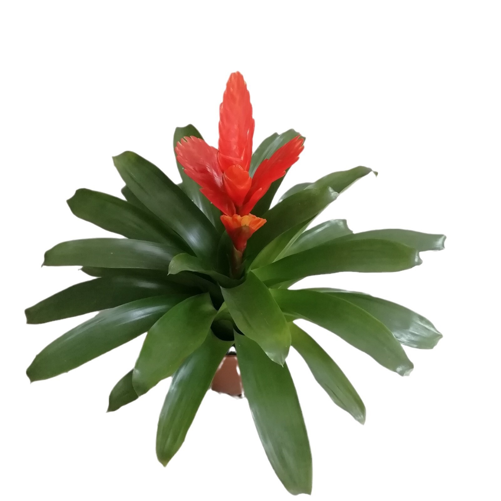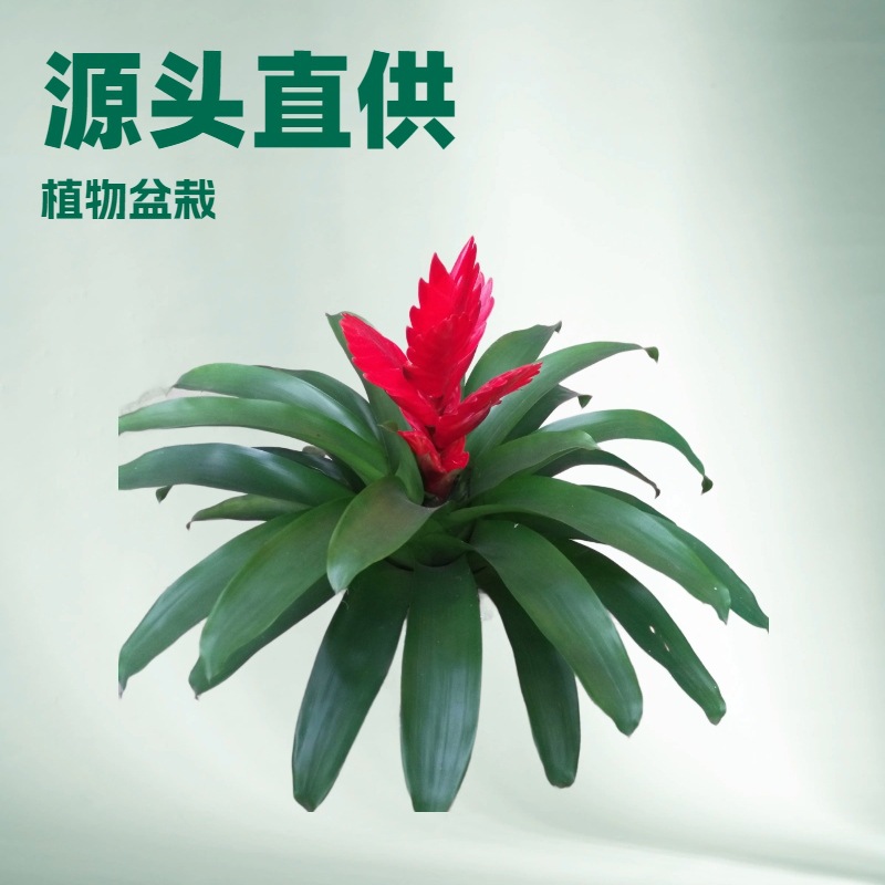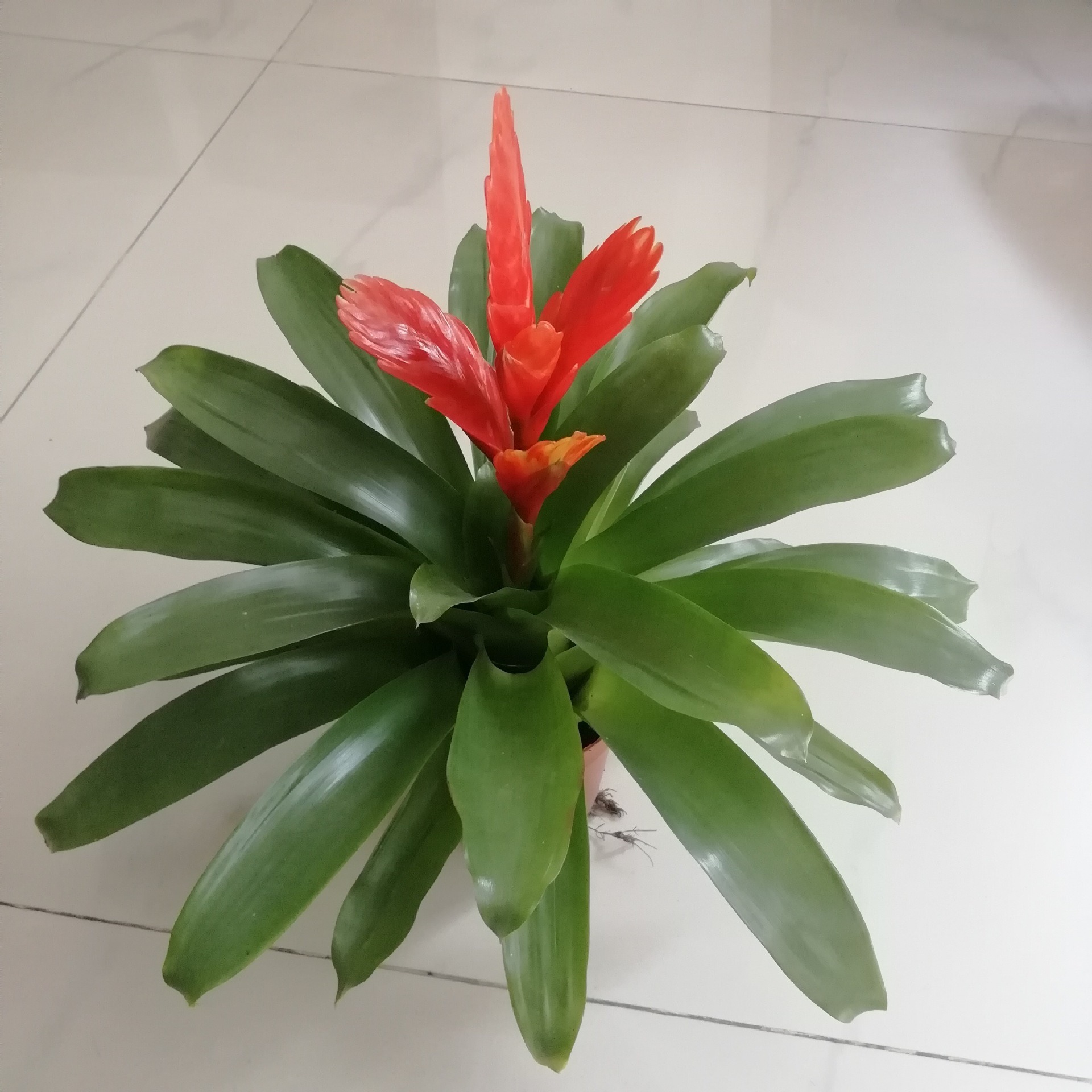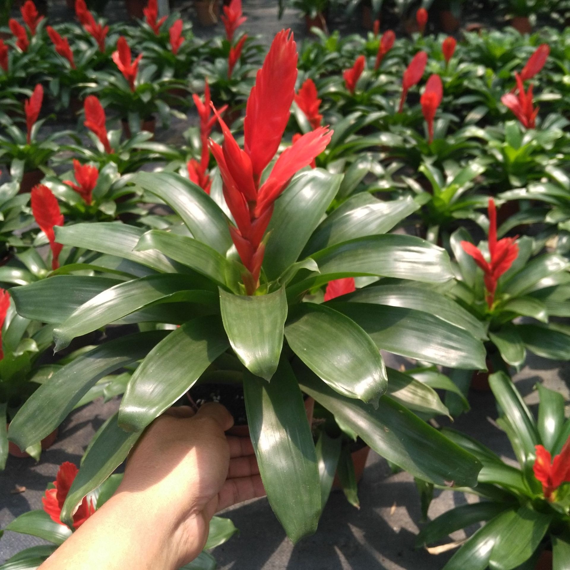 常绿多年生草本植物。附生性小型凤梨。株高30厘米左右。叶从生,呈杯形。叶带状,长20-30厘米,宽l.5-3厘米,肉质,较薄,鲜绿色,有光泽。复穗状花序,花刁细小,直立,自叶丛中抽生。花苞刁状,基部艳红,端部黄绿色或嫩黄色。花小,黄色。观赏期长达1个月左右。热带常绿草本植物。喜高温多湿的气候和光照充足的环境。稍耐阴,有一定的耐寒、耐旱能力,忌烈日暴晒。适宜生长在肥沃、湿润、疏松和排水良好的土壤中。生长适宜温度20-30℃。生长期除复季需要遮荫,避免强阳光直射外,其他季节都要尽量多接受阳光照射。夏季应放在疏荫处或室内光线明亮的地方,烈日暴晒会使叶片灼伤。光线不足,花色不鲜红艳丽,缺少光泽,会降低观赏价值。冬季应人室,放在向阳处,如果能将温度保持住15℃以上,植株仍可继续生长。最低温度一般不要低于10℃,避免长期低温使植株受到冻害。