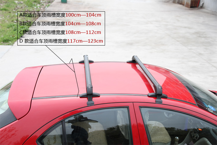 拍下请注明车型或车顶宽度,也可咨询客服(建议自行量好车顶宽度,避免不必要的麻烦),A款90cm适合100cm—104cm车顶雨槽宽度,B款95cm适合104cm—108cm车顶雨槽宽度,C款100cm适合108cm—112cm车顶雨槽宽度,D款110cm适合117cm—123cm车顶雨槽宽度。