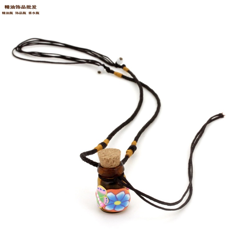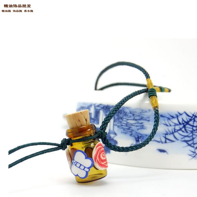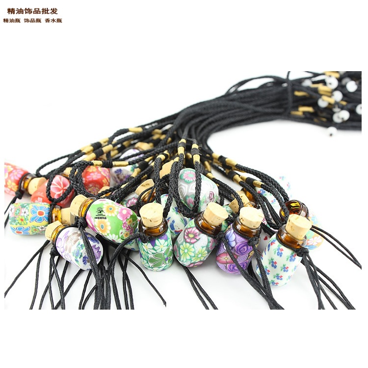 这个是装精油的软陶装饰套小瓶子,可以配合精油使用,夏天挂在脖子上可以装饰、。容量是1毫升,如果觉得香味散发不出来,可以用很细的针比如大头针,在胶木塞上面扎几个小孔,千万不要把胶木塞搞坏了,要不精油会漏出来的。挂绳是可以收紧和放松的。