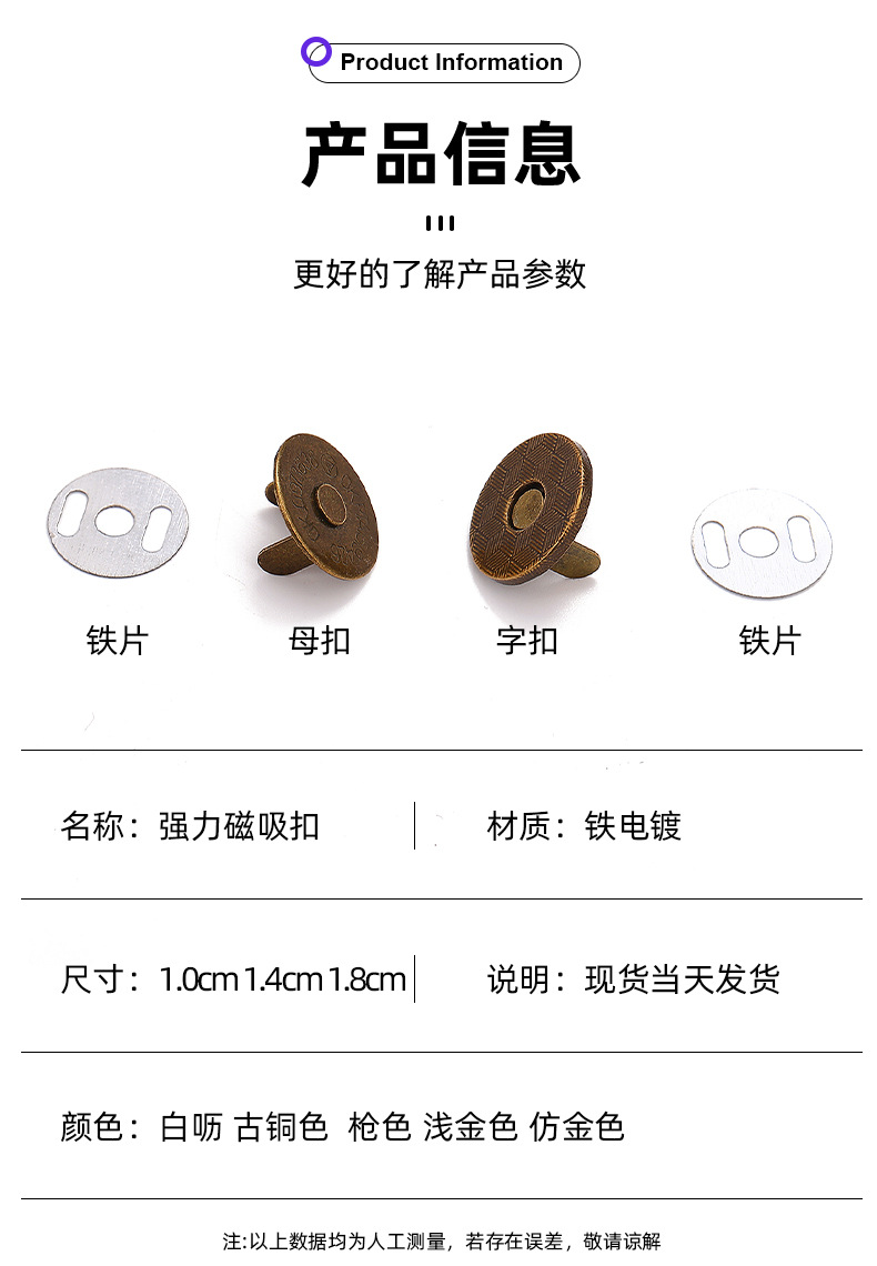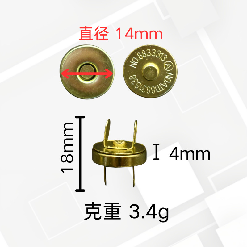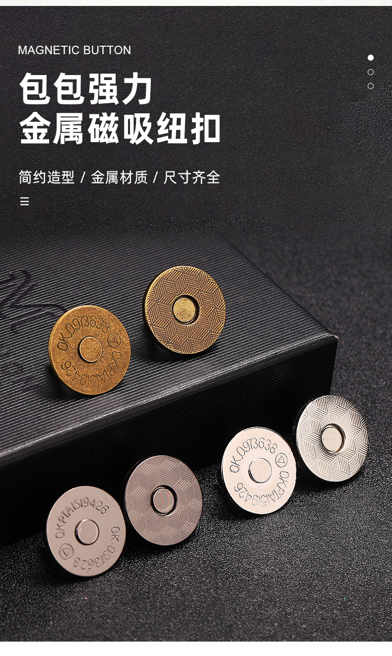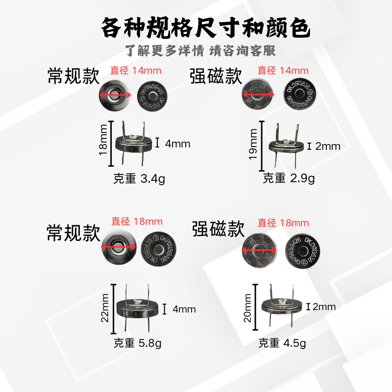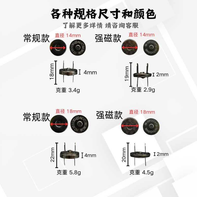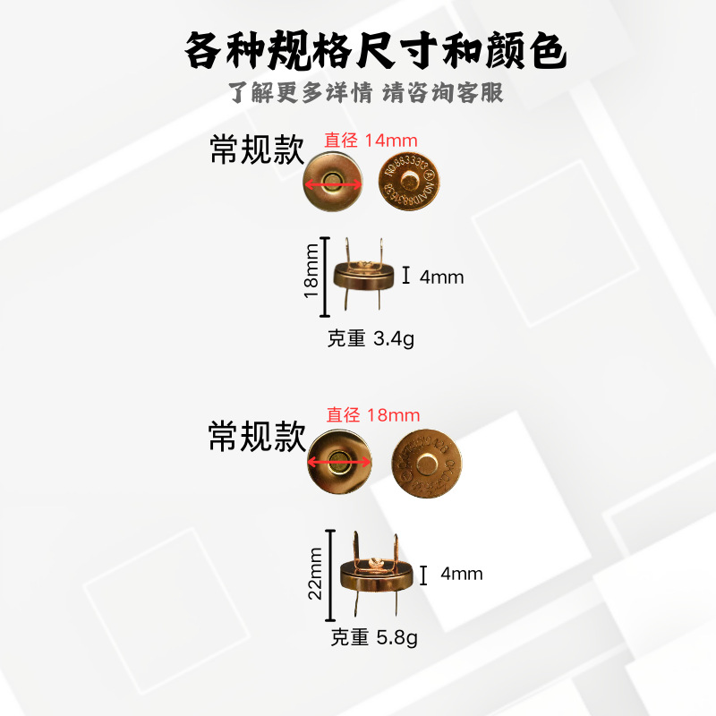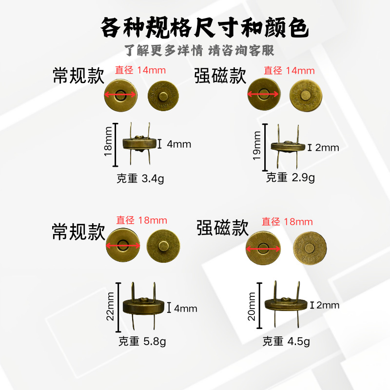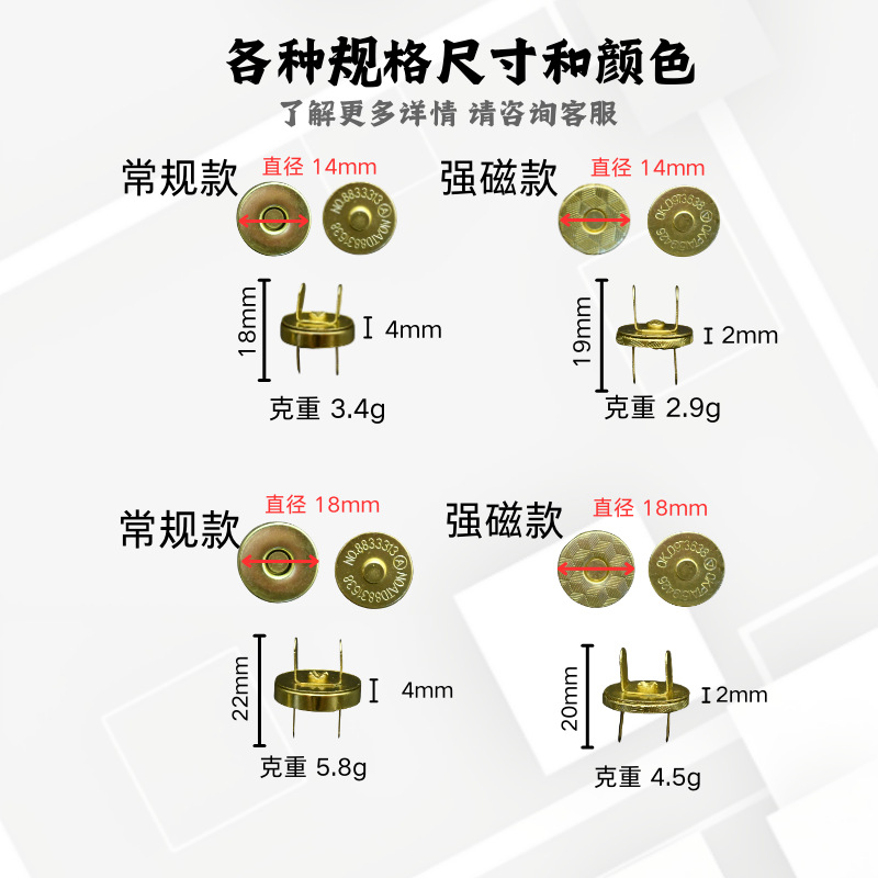18 мм, большой, белый; 18 мм крупная бронза; 18 мм крупная имитация золота; 18 мм, цвет «оружейная сталь»; 18 мм, крупный, светло-золотой; 18 мм, ультра-белый, мощный магнит; Большой супербронзовый мощный магнит диаметром 18 мм.; 18 мм крупный супер-имитация золота с мощным магнитом; 18-мм крупный супер-магнит с прочным цветным покрытием; 18 мм крупный ультралегкий золотой магнит с высокой силой притяжения; 14 мм тонкий белый; 14 мм тонкая бронза; 14 мм тонкое имитированное золото; 14 мм, тонкий, цвет «пистолетный»; 14 мм тонкий светло-золотой; Толщина 14 мм, ультра-белый, сильный магнит.; 14 мм тонкий суперпрочный магнит из бронзы; 14 мм тонкий супер-имитация золота с мощным магнитом; 14 мм тонкий супер-магнит с прочным цветным покрытием; Ультралегкий золотой магнит толщиной 14 мм.