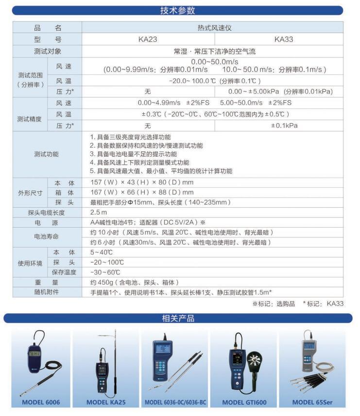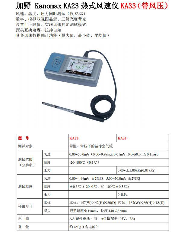 加野麦克斯KANOMAX KA23热线式风速计技术参数: