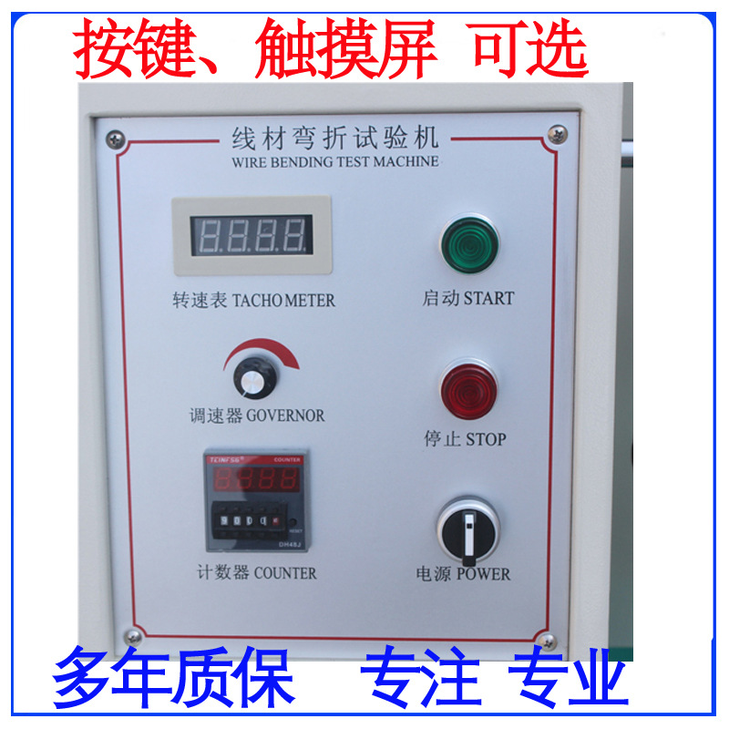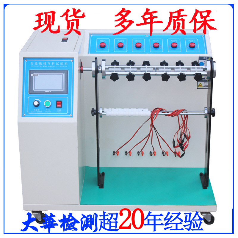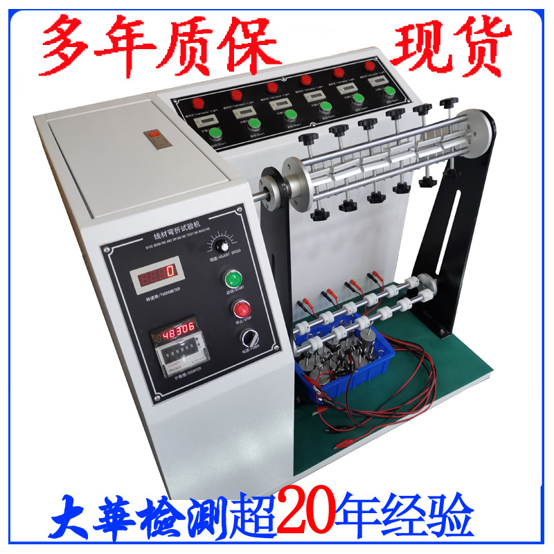 本机试法是将试料固定在夹具上,并加一定荷重,试验时夹具左右摆动,经一定次数后,检视其断线率;或至无法通电时,查看其总极摆动次数。本机能自动计数,试料弯折至无法通电时,并能自动停止操作。