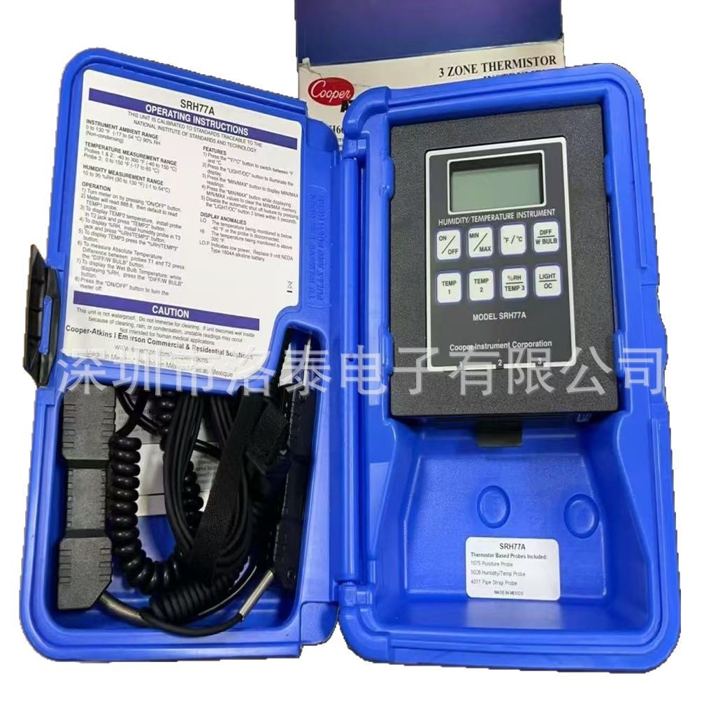 SRH77A的功能包括一个适于黑暗环境的背光显示屏,防止仪器泄漏和落灰尘的密封键盘,以及一个电池限制器插孔。三区、最低/最高温储存。在不使用或连续模式情况下可在15分钟后自动关闭。其主要以1区和2区间的温度差、相对湿度和湿球为主。连续扫描功能从三个探针记录最小/最大温度,且允许技术人员在完成其他任务的同时监控远程临界温度。SRH77A-E包括:新型1075通用穿刺探头,探头的4011管带,和型号5028的湿度探头。