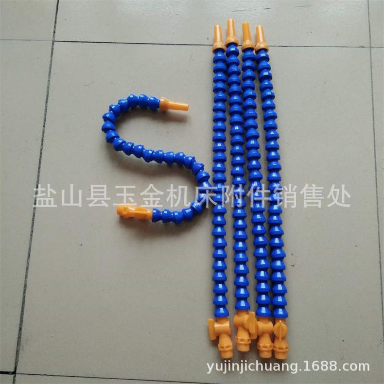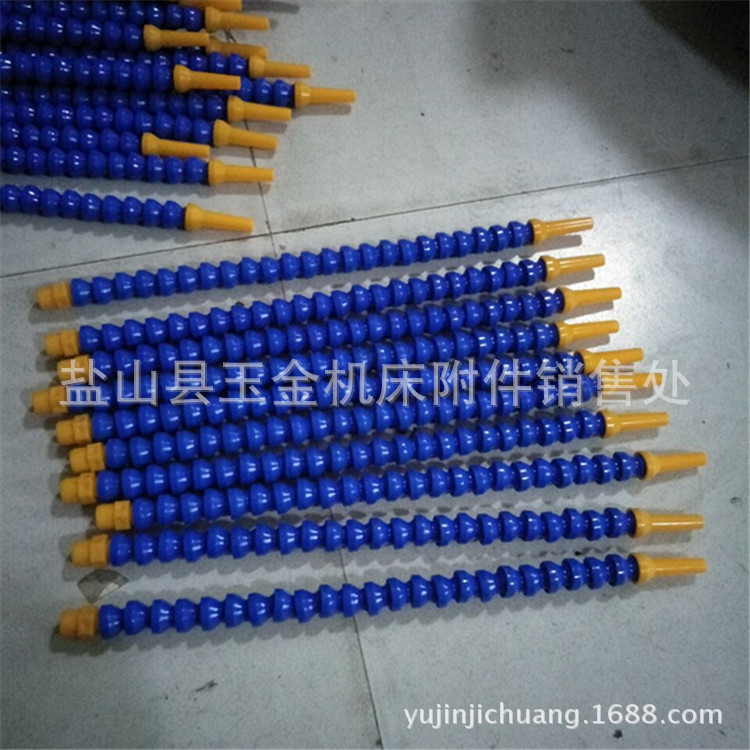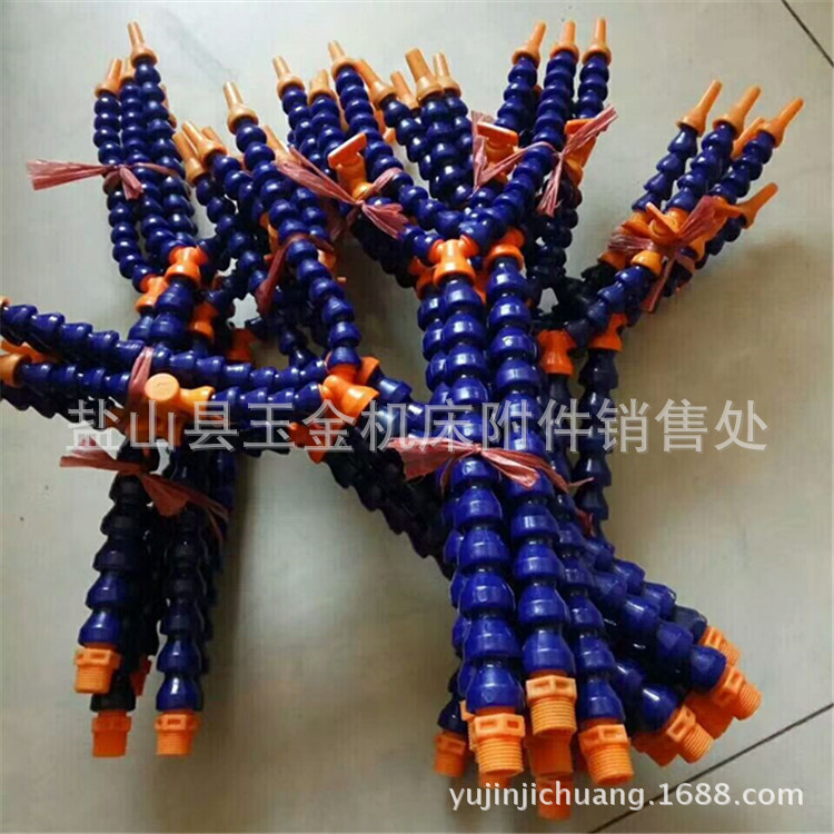 5、冷却水管又名冷却管,万向油管,喷嘴。按材质可以分为金属冷却水管和工程塑料冷却水管。金属冷却管表面做镀铬处理,不生锈不氧化,出水嘴型有圆嘴和扁嘴;工程塑料冷却管材质为尼龙66,颜色有蓝色,灰色,桔红,黑色,白色;出水嘴型有圆嘴,扁嘴和大口径圆嘴型。这两类冷却管均使用于机床液压机械,数控机床作油,水冷却系统配用,该产品通过手工装配,可任意调节使用长度,使用方向,喷嘴直径大小圆扁护换,也可按客户的要求配上开关。