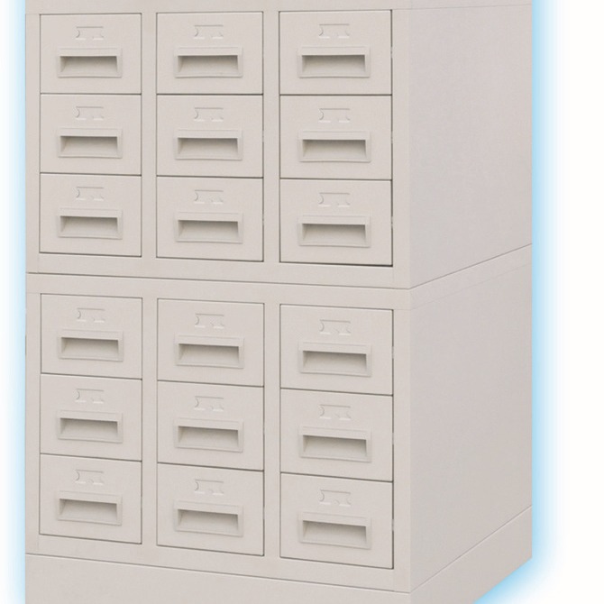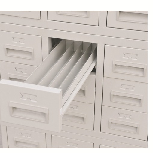 柜体采用0.8mm宝钢冷轧钢板,抽屉自动归位功能,每套4组合,每组合9个抽屉,共36个抽屉,约放切片55000片。柜体经防锈处理,静电喷塑工艺,整体美观大方。最新利用槽式滑轮,起始点配高强度滑轮,抽屉推拉顺畅,同时防止抽屉拉出来过长造成意外跌落。另配高弹性减震垫,可使抽屉关闭时减轻与柜体的碰撞,同时使噪音减少至最低限度