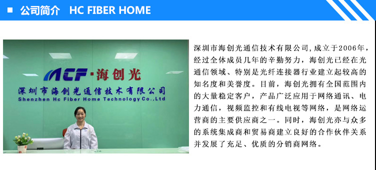 连接器的插芯材质有陶瓷,金属,塑料等,每种连接器有不同颜色的外框与尾套供选择。通过固化研磨等工艺,光纤连接器被用来与各种类型的光缆制作成各种类型的跳线或尾纤,被广泛运用到通信机房、光纤到户、局域网络、光纤传感器、光纤通信系统、光纤连接传输设备、国防战备等。本公司早在1998年便跟国家邮电科学研究院密切合作,将科研成果成功的转化成批量生产,开创了中国光通信的新纪元。后续便不断的开发出LC,FC等连接器,满足了日益增长的市场需求。产品符合IEC标准及行业标准GR-326,材质都经过第三方检测,符合国家标准,符合Rohs等要求,自从2005年在深圳建立营销中心与研发中心后,产品走向美国、德国、韩国、日本等国家,并赢得好评。如果您有其他特殊的要求,本司将专门为您量身定做以满足您的需求。