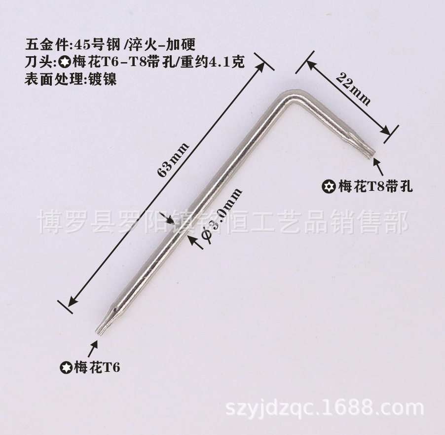 刀杆粗3mm,长边(T6梅花)63MM,短边(T8梅花带孔)22MM