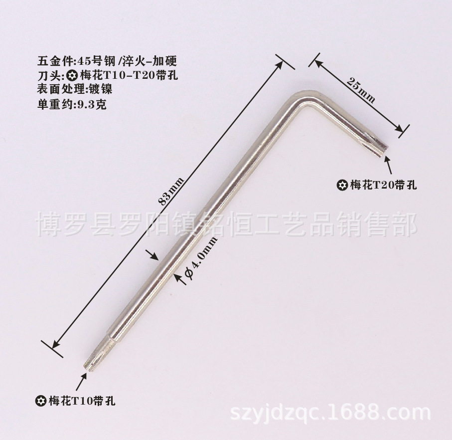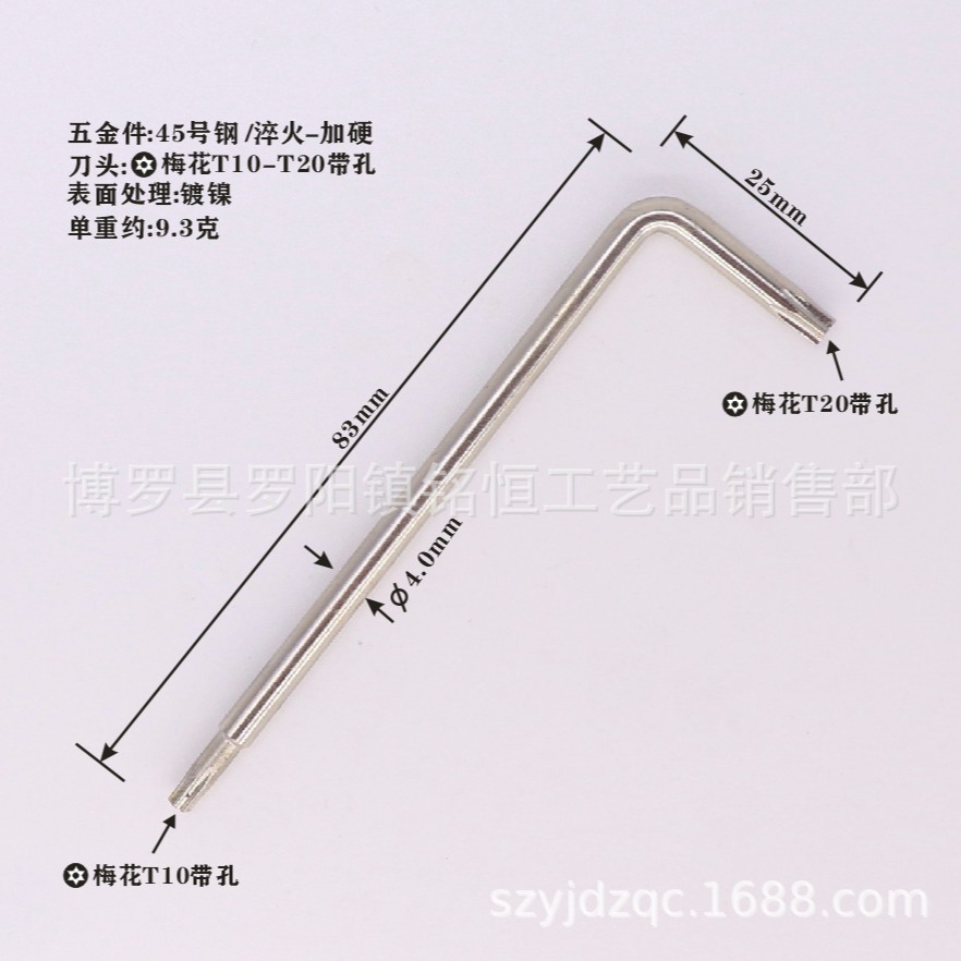 刀杆粗4mm,长边(T20带孔梅花)83MM,短边(T10带孔梅花变径)25MM,