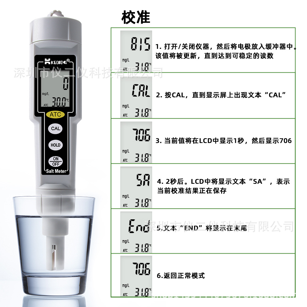 CT—3080笔式盐度计采用了单片机技术,LCD显示,自动温度补偿和温度显示功能,一点校正。电极在内的一体式数字笔式电导,并且电极可以更换,外壳可以防水。