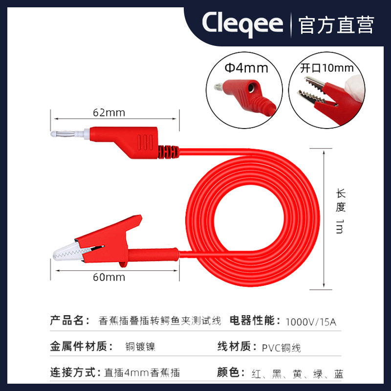 One end of the test lead is a stackable standard 4mm banana plug. The other end is a pure copper insulated alligator clip. Lead length: 3ft. Voltage: 1000V. Current: 15A. - 4mm Banana Plug is stackable. You can plug more than one banana plug into the same banana socket. Sturdy Banana Plugs and insulation greatly enhance durability and flexibility of the leads.