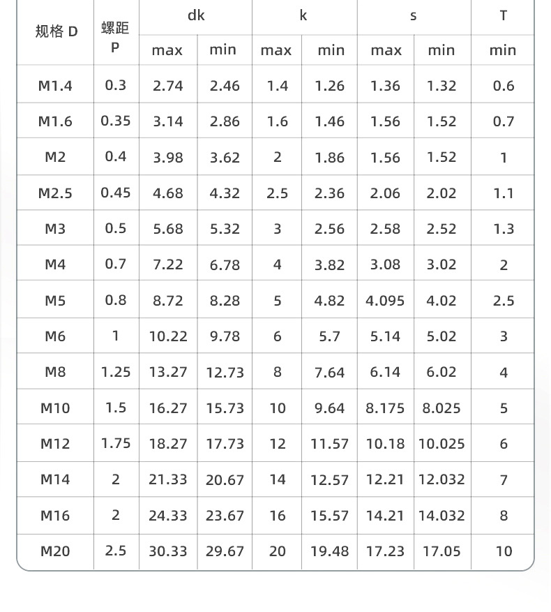 M1.4*3; M1.4*4; M1.4*5; M1.4*6; M1.4*8; M1.4*10; M1.4*12; M1.4*14; M1.4*16; M1.6*3; M1.6*4; M1.6*5; M1.6*6; M1.6*8; M1.6*10; M1.6*12; M1.6*14; M1.6*16; M1.6*18; M1.6*20; M2*3; M2*4; M2*5; M2*6; M2*8; M2*10; M2*12; M2*14; M2*16; M2*18; M2*20; M2*22; M2*25; M2*30; M2*35; M2*40; M2.5*3; M2.5*4; M2.5*5; M2.5*6; M2.5*8; M2.5*10; M2.5*12; M2.5*14; M2.5*16; M2.5*18; M2.5*20; M2.5*22; M2.5*25; M2.5*30; M2.5*35; M2.5*40; M2.5*45; M2.5*50; M3*3; M3*4; M3*5; M3*6; M3*7; M3*8; M3*10; M3*12; M3*14; M3*15; M3*16; M3*18; M3*20; M3*22; M3*25; M3*28; M3*30; M3*35; M3*40; M3*45; M3*50; M3*55; M3*60; M3*65; M3*70; M3*75; M3*80; M3*85; M3*90; M3*95; M3*100; M3*110; M3*120; M4*4; M4*5; M4*6; M4*8; M4*10; M4*12; M4*14; M4*15; M4*16; M4*18; M4*20; M4*22; M4*25; M4*28; M4*30; M4*35; M4*40; M4*45; M4*50; M4*55; M4*60; M4*65; M4*70; M4*75; M4*80; M4*85; M4*90; M4*95; M4*100; M4*110; M4*120; M4*130; M4*140; M4*150; M5*5; M5*6; M5*8; M5*10; M5*12; M5*14; M5*16; M5*18; M5*20; M5*22; M5*25; M5*28; M5*30; M5*35; M5*40; M5*45; M5*50; M5*55; M5*60; M5*65; M5*70; M5*75; M5*80; M5*85; M5*90; M5*95; M5*100; M5*110; M5*120; M5*130; M5*140; M5*150; M6*8; M6*10; M6*12; M6*14; M6*16; M6*18; M6*20; M6*22; M6*25; M6*30; M6*35; M6*40; M6*45; M6*50; M6*55; M6*60; M6*65; M6*70; M6*75; M6*80; M6*85; M6*90; M6*95; M6*100; M8*8; M8*10; M8*12; M8*14; M8*16; M8*18; M8*20; M8*25; M8*30; M8*35; M8*40; M8*45; M8*50; M8*55; M8*60; M8*65; M8*70; M8*75; M8*80; M8*85; M8*90; M8*95; M8*100; M8*110; M8*120; M8*130; M8*150; M8*200; M10*16; M10*18; M10*20; M10*22; M10*25; M10*30; M10*35; M10*40; M10*45; M10*50; M10*55; M10*60; M10*65; M10*70; M10*80; M10*100; M10*150; M12*16; M12*20; M12*25; M12*30; M12*35; M12*40; M12*45; M12*50; M12*55; M12*60; M12*65; M12*70; M12*75; M12*80; M12*90; M12*100