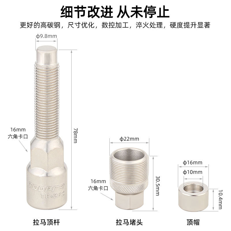 特点:采用优质高碳钢,数控攻牙,淬火加硬全电镀热处理,加粗顶帽,不伤中轴,表面喷砂处理。