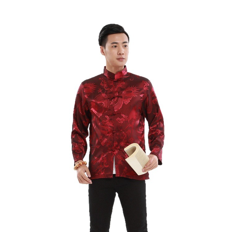 Мужская рубашка в этническом стиле, весенне-летняя, с воротником-стойкой, на пуговицах, с рисунком дракона, длинный рукав, китайский стиль, для выступлений