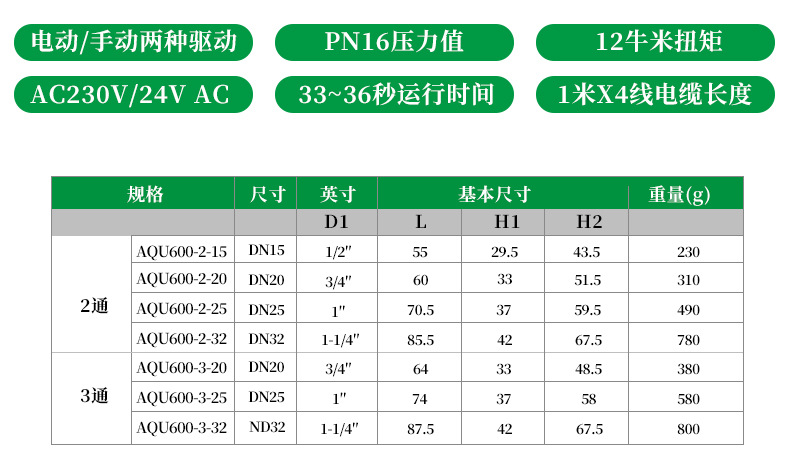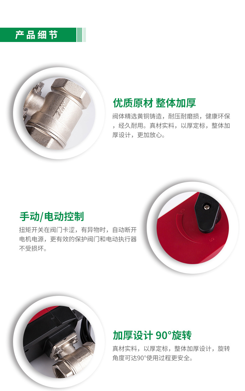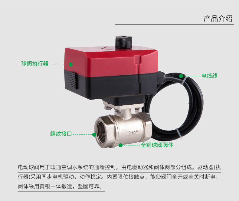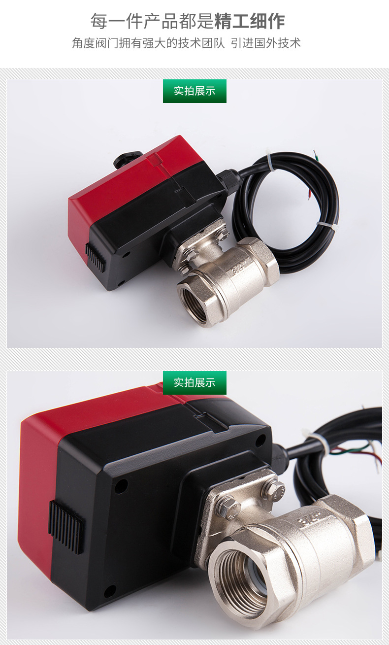 此款电动球阀,适用于暖通空调及水系统状态控制。阀体采用ISO5211标准平台,该驱动器的使用同步电机带动齿轮平稳。新产品满足客户要求,体积小,扭矩大,操作简单,免维护,在不同的工作条件下安装方便。此外,执行机构配有手动手柄,因此可以在断电或其他紧急情况下开启或关闭阀门。