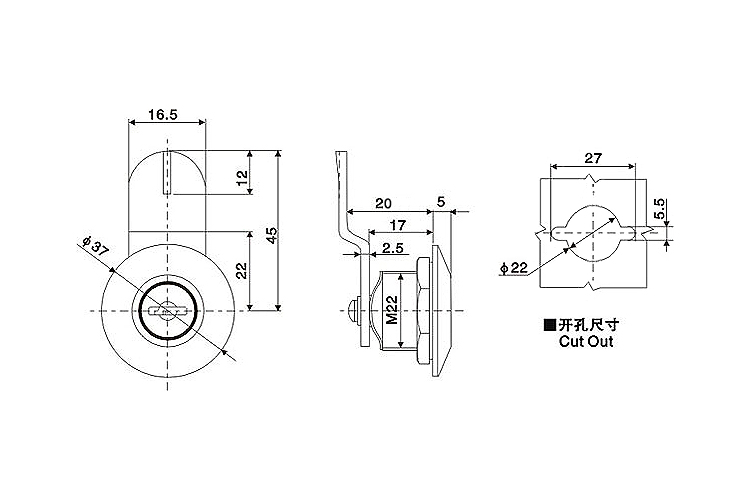 【安装】将螺母拧出,将锁放入开好的孔中,拧上螺母。
