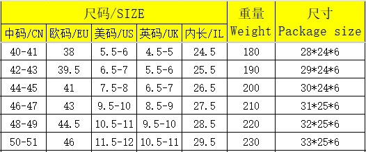 【关于码数】 按运动鞋/布鞋/皮鞋码数对比: 男39-40建议拍280的 男41-42建议拍290的 男43建议拍300的 男44-45的建议拍310的 男46-48的建议拍320的 友情提示:这些建议码数都是按客户的反馈经验积累的,给我们一份信任,绝对给你一个满意的合适的鞋子 【女鞋都是标准码数的】 【如有不清楚的 可以联系客服