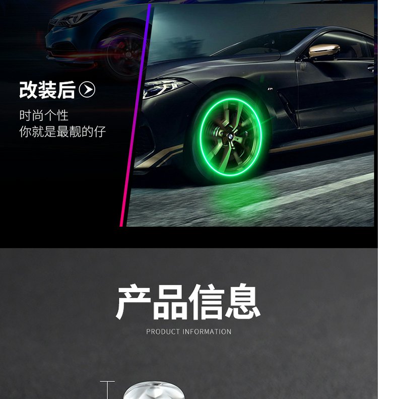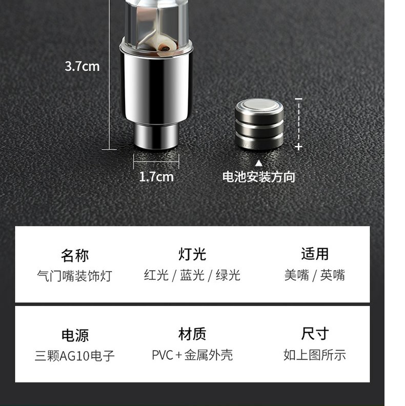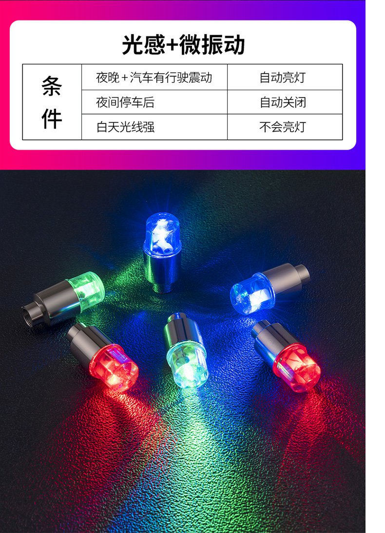 【说明】“风火轮”是研发的“汽车、摩托、电动车、自行车”车轮动态闪光装饰品,由光控电路、动态感应电路、发光电路组成,独立电路设计,无需改动或连接车体本身电路,装于爱车车轮的气门嘴上.白天或停车时不闪光,当车子在晚上移动时就会亮了。亮点即形成一道亮丽的光环,称之为风火轮,给您带来驾驶乐趣,我保证装上这个东西,你的爱车回头率高!!同时汽门嘴具有防水、遇暗移动发光等防水节电功能。