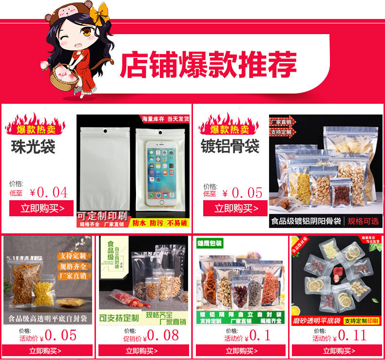 | 7*18cm | 0.07元/个 | 点击进入 | 16*24cm | 0.18元/个 | 点击进入 |