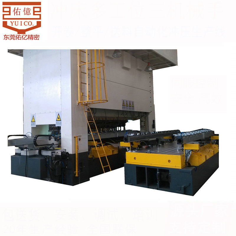 1.同步源为数个伺服马达,由连结冲床曲轴之编码器传送角度信号至控制系统达成与冲床同步运作之功能。