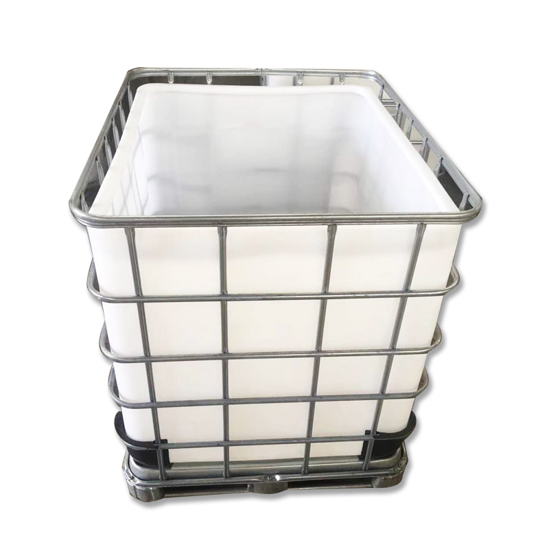 2、IBC集装桶的内容器采用高密度聚乙烯材料,外护套为镀锌钢管焊接的网格,底盘采用四向进叉型全钢型托盘,放置稳固,便于排除容器内的残余物。