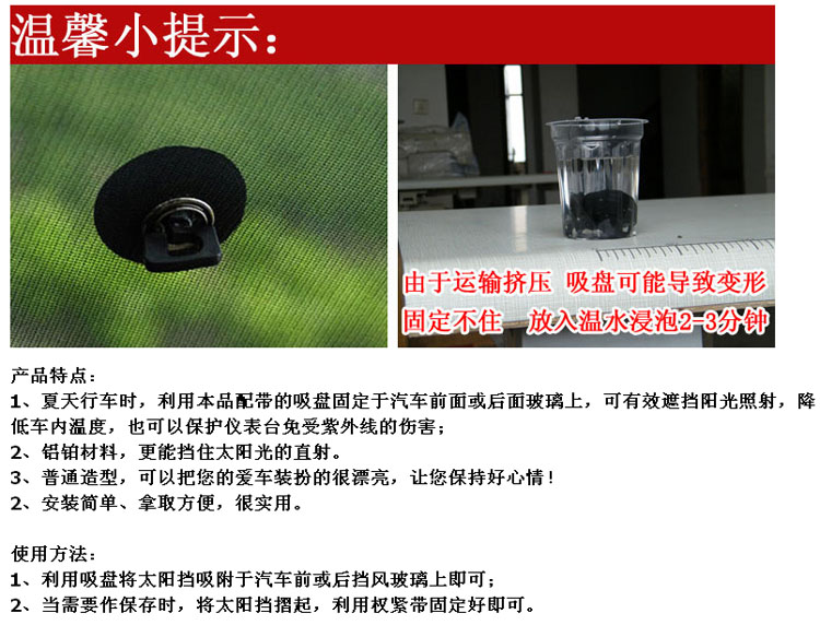 3、产品附有PVC吸盘牢牢吸附与玻璃内侧,让这个夏天不再热。
