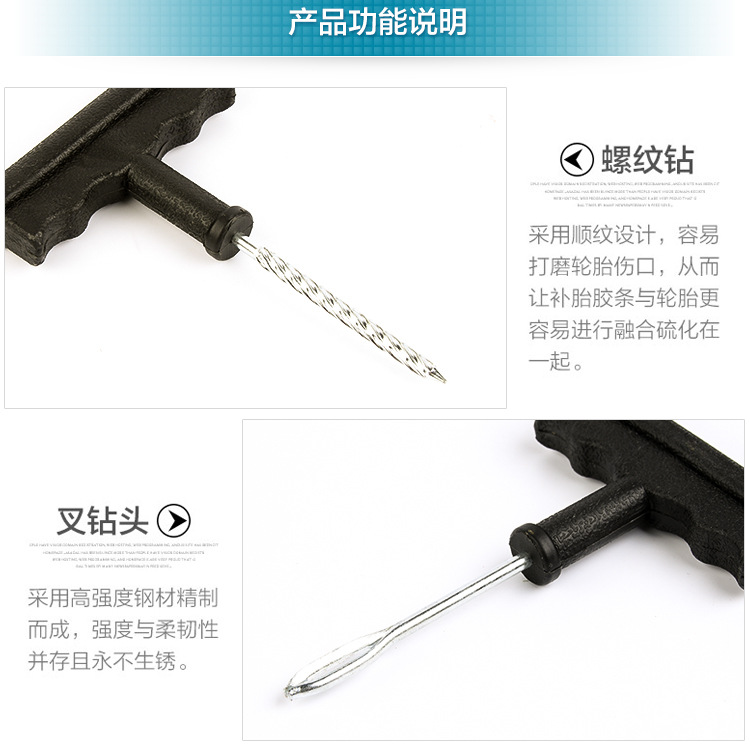 2.用补胎探针探明破孔穿透方向,顺破孔方向插入抽动以清除破孔内灰尘杂物。