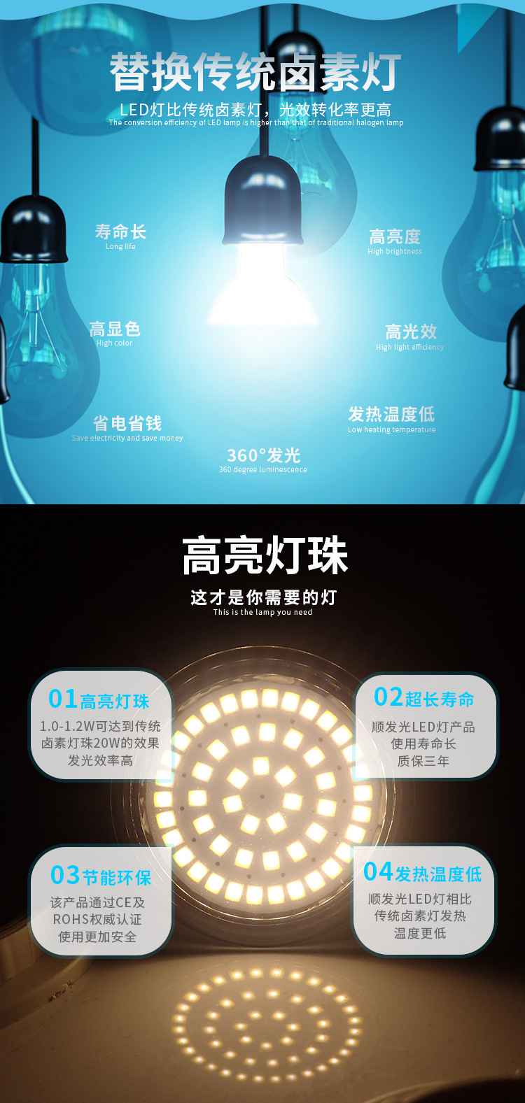 | 材 料: | 陶瓷+PC罩+灯杯 | 发光角度: | 360° | 1000个装 | 暖白光:2700-3100K | |
