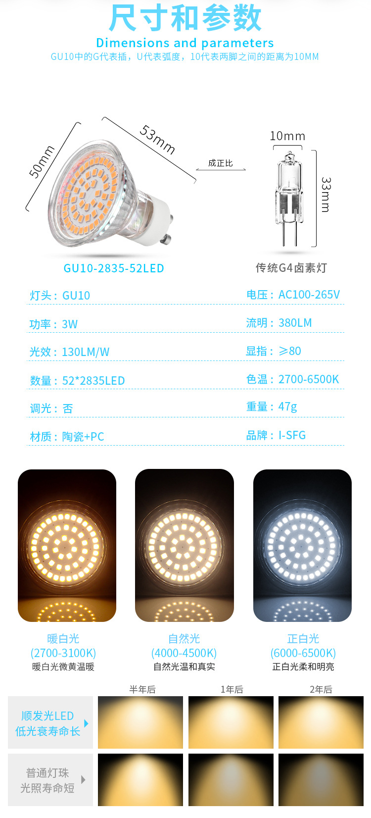 | 接 口: | GU10 | 功率因数: | 0.5 | 100个装 | 自然白:4000-4500K | |