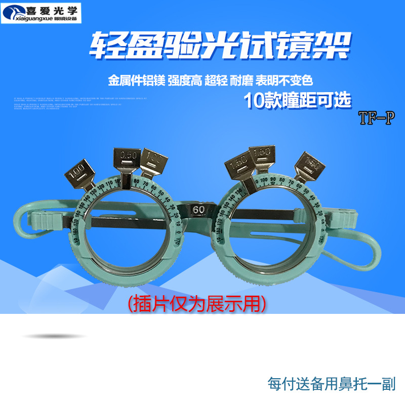 特点:金属件铝镁,强度高,超轻,耐磨,表面不变色,单付重量仅23.5克;6格伸缩镜腿,拉伸手感好,记忆塑料,可90度折弯弹回、不发白;轴位精准,误差率1度之内,360度轴位可视,插片后正反方向转动平顺;根据插片弧度设计的镜片卡槽弹力好,插片后倒放晃动也不会掉下去;高低鼻托自由选择;插片试戴符合人体鼻梁结构;