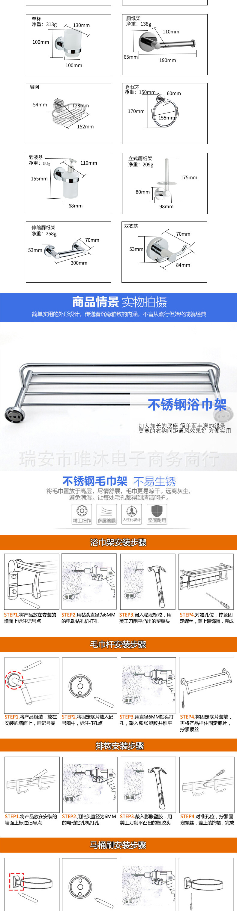 Полотенце Кольцо; держатель для туалетной бумаги; Двойной Пальто Крючком; Одиночная чашка; одиночный диск; Держатель для туалетной бумаги с крышкой; Рама воздуходувки; Мыло Чистая; Одно-полюс вешалка для полотенец; дозатор мыла; Вертикальный держатель туалетной бумаги; Маленький крючок 5 крючков; Двойная чашка; Нержавеющая сталь туалетная щетка; Выдвижной держатель туалетной бумаги; Двухместная вешалка для полотенец; вешалка для полотенец