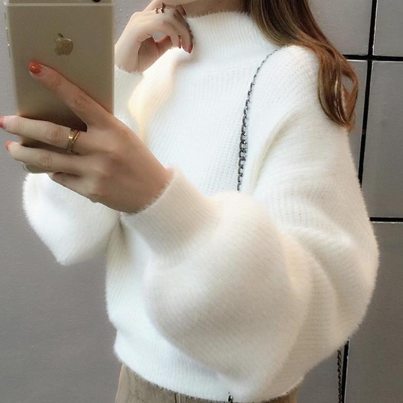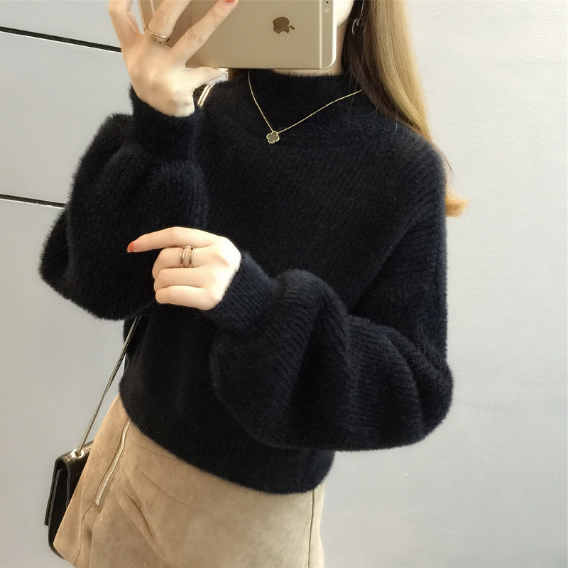 Женский укороченный свитер в корейском стиле 2025 года, новинка весны, осени и зимы, свободная верхняя одежда с рукавами-фонариками, трикотажный базовый слой с полувысоким воротником.