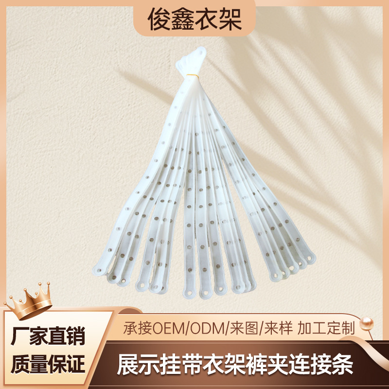 Реквизит для витрин магазинов одежды от производителя: подвесные ремни, вешалки, зажимы для брюк, соединительные планки и набор с белыми прозрачными кожаными полосками для хранения.