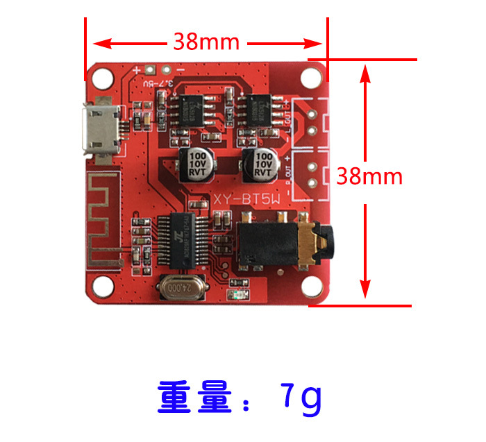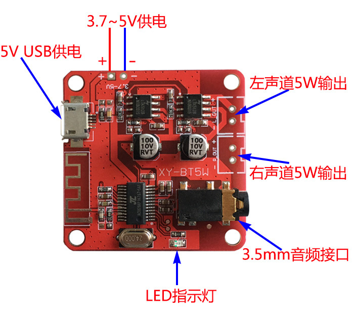 支持蓝牙4.2版本,3.7-5V供电,支持自动回连功能,板载立体声D类功放模块,最大输出5W+5W,可接两个4?6?8 3W(5W)喇叭。