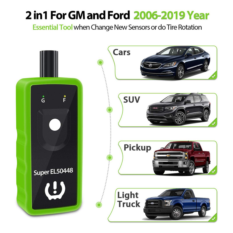 Super EL50448是GM和Ford二合一的胎压学习设备,该设备使用9V电池,最新2023款