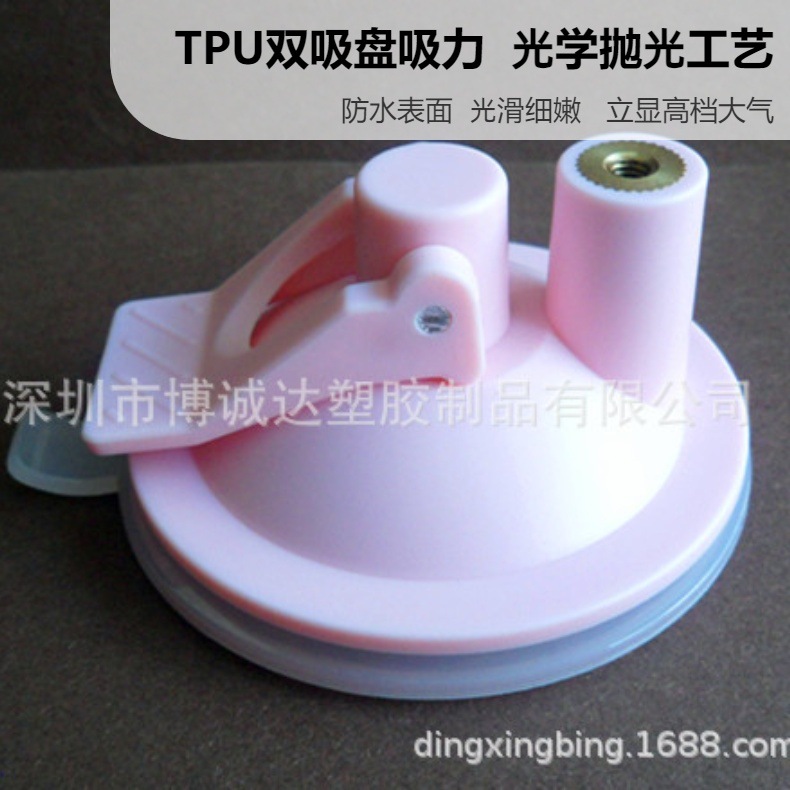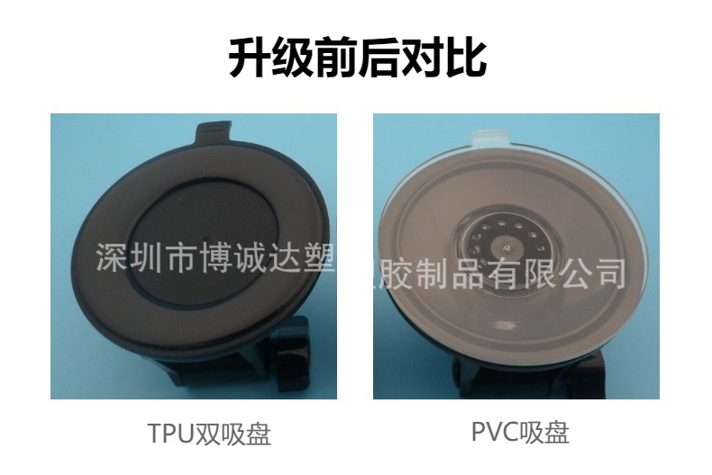 TPU双吸盘,最大的优势是不仅能吸附在光滑物体表面,还能吸附在不光滑物体表面(如有木纹、皮纹的表面等), 而PVC吸盘只能吸附在光滑物体表面。
