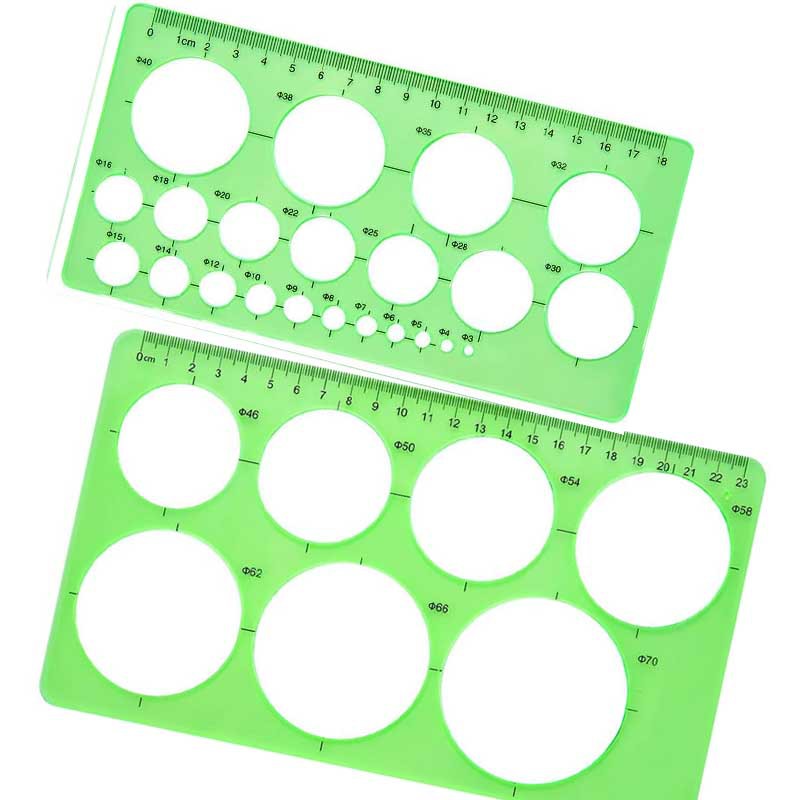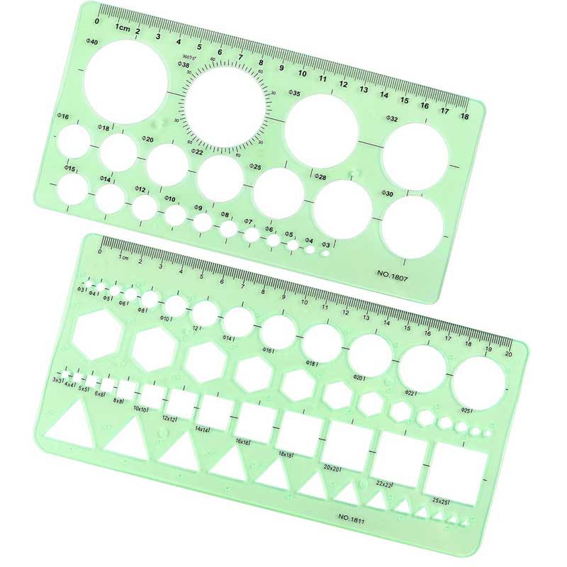 Rulers measurement: use metric system and take centimeter as scale unit; These drawing templates have differences in size, the length ranges from 17.8 to 25 cm/ 7 to 9.84 inches, the width ranges from 9.4 to 14.7 cm/ 3.7 and 5.8 inches