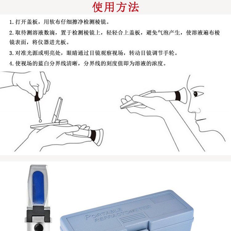打开盖板(3),用软布仔细擦净检测棱镜(2)。取待测溶液数滴,置于检测棱镜上,轻轻合上盖板,避免气泡产生,使溶液遍布棱镜表面。将仪器进光板(3)对准光源或明亮处,眼睛通过目镜观察视场,转动目镜调节手轮(6),使视场的蓝白分界线清晰。分界线的刻度值即为溶液的浓度。