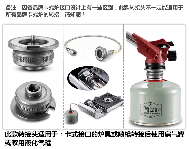 用上不同的接头,原用卡式气罐的,可转用扁气罐、曼普气/固特气或液化气。
