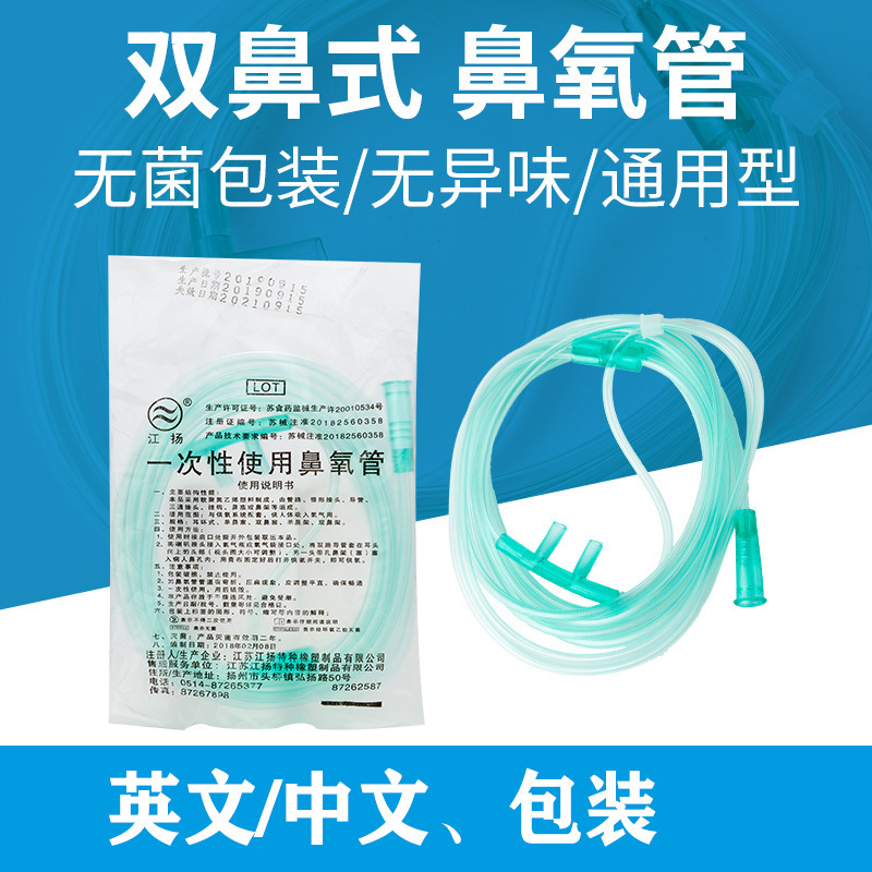 一次性使用鼻氧管采用符合GB15593的软聚氯乙烯塑料制成,按型式分为鼻架式、双鼻塞型、单鼻塞型、挂耳式和直式五种。鼻架式鼻氧管由接头、粗导管、单/双鼻架、两通接头、细导管组成;双鼻塞型鼻氧管由接头、粗导管、鼻塞、两通接头、细导管组成;单鼻塞型鼻氧管由接头、粗导管、鼻塞、套圈(可没有)组成;挂耳式鼻氧管由接头、细导管、鼻塞、挂钩组成;