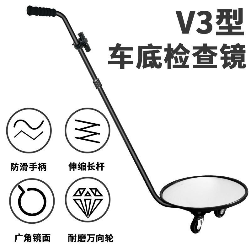 V3车底检查镜适用于汽修厂、学校、检查站、海关边防等。本品经济便携,简单明了,配有三个支撑活动轮子,推动轻便,应用于检查车底、桌子、凳子等底部是否有异常或携带易燃易爆物品。