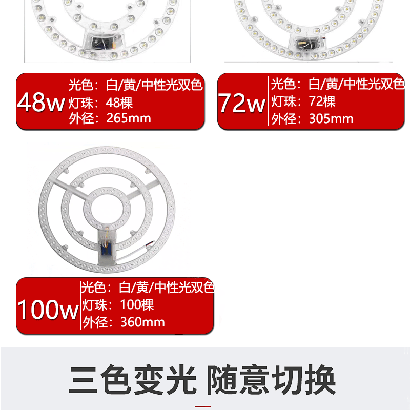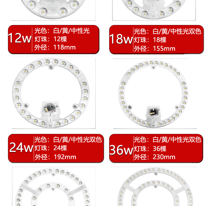 12 Вт монохромный 118 мм; 18 Вт монохромный 155 мм; 24 Вт монохромный 192 мм; 36 Вт монохромный 230 мм; 48 Вт монохромный 265 мм; 72 Вт монохромный 305 мм; 100 Вт монохромный 360 мм; 12 Вт двухцветный 118 мм; 18 Вт двухцветный 155 мм; 24 Вт двухцветный 192 мм; 36 Вт двухцветный 230 мм; 48 Вт двухцветный 265 мм; 72 Вт двухцветный 305 мм; 100 Вт двухцветный 360 мм; 48 Вт, плавная регулировка яркости, двухцветный, 265 мм; 72 Вт, плавная регулировка яркости, двухцветный, 305 мм; 100 Вт, плавная регулировка яркости, двухцветный, 360 мм