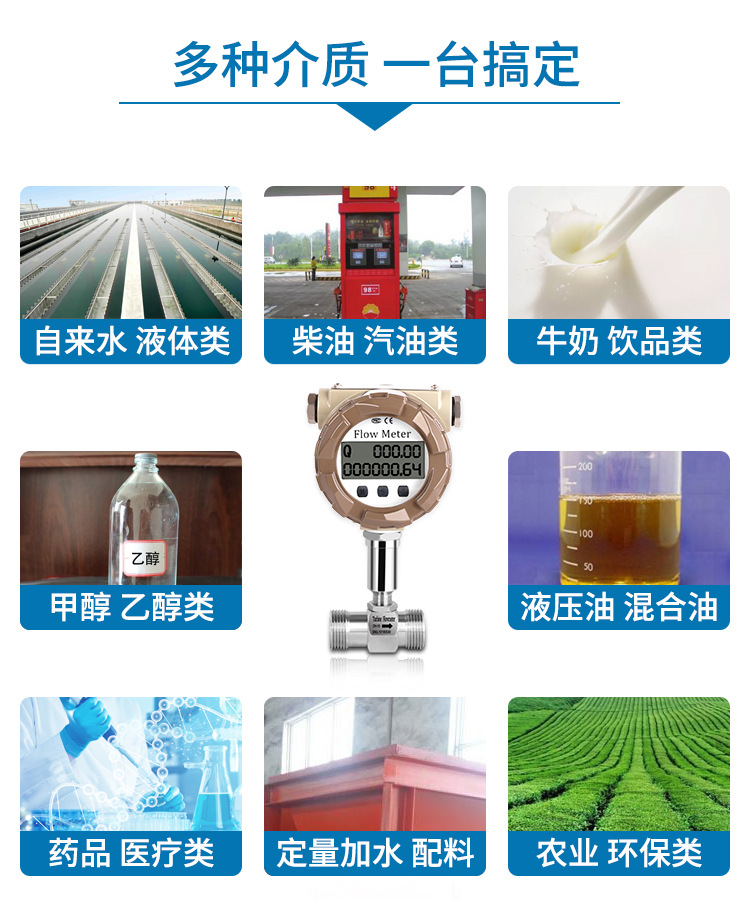 涡轮流量计(甲醇流量计)是一种精密流量测量仪表,与相应的流量积算仪表配套可用于测量液体的流量和总量。液体涡轮流量计广泛用于石油、化工、冶金、科研等领域的计量、控制系统。配备有卫生接头的液体涡轮流量计可以应用于制药行业。