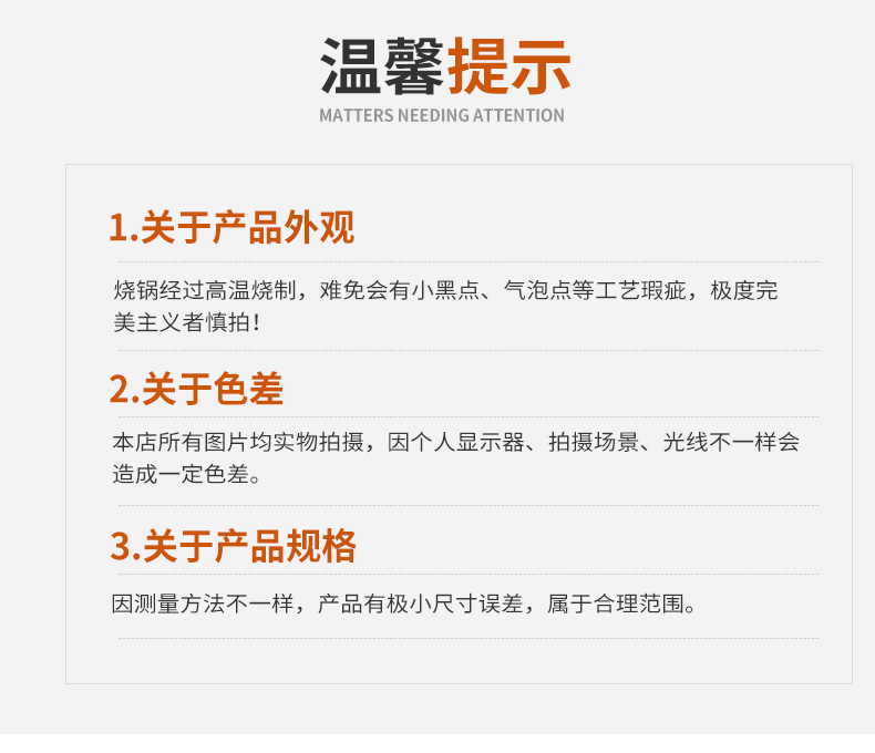 2.陶瓷品有不可控因素,每一窑都会有色差,多少都会跟图片有些微差异,色差不列入瑕疵品范围。
