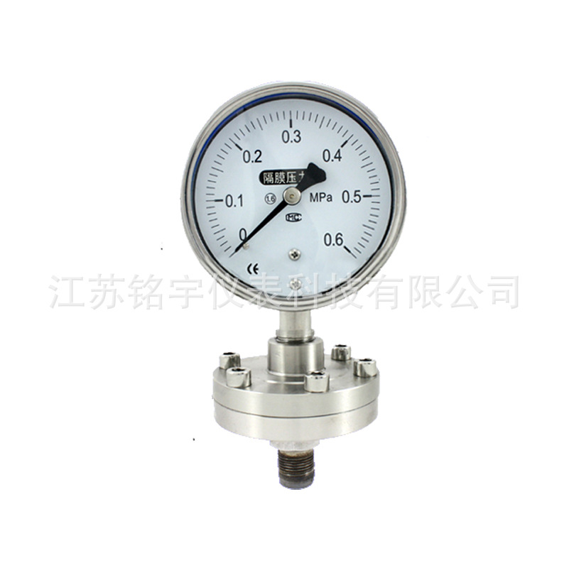 隔膜压力表由各种通用型压力仪表和不同结构的隔膜隔离器组成一个封闭系统,内充密封液。当被测介质的压力作用于隔膜时,则隔膜产生变形,压缩封闭系统中的密封液。由于密封液的固有性质,使压力仪表中的弹性元件产生相应的弹性变形——位移,经指示装置显示压力值。当隔膜的刚度足够小时,则压力仪表指示的压力就近于被子测介质的压力值。