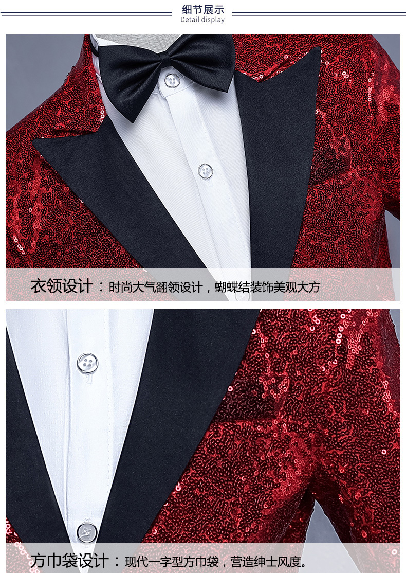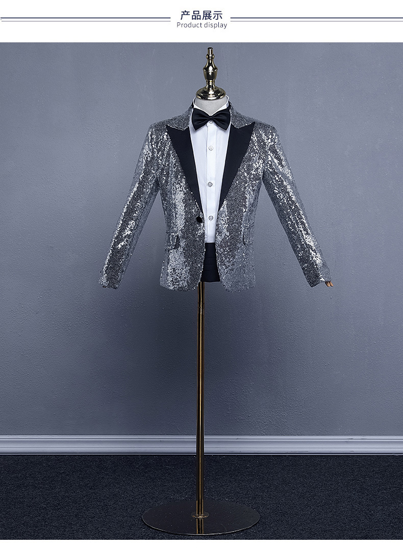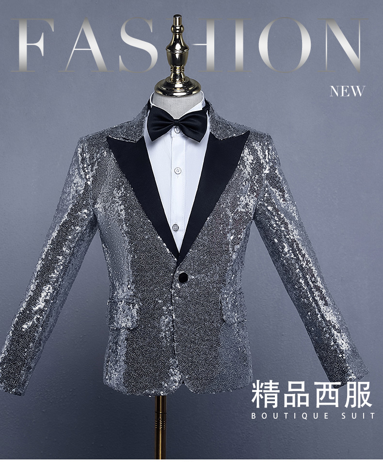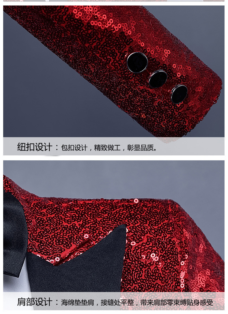 注意事项:因为亮片西装比较亮在拍摄过程中图片和实物有稍许色差,因为灯光打亮了衣服亮片太亮,打暗了衣服图片又会暗一点,所以介意者慎拍