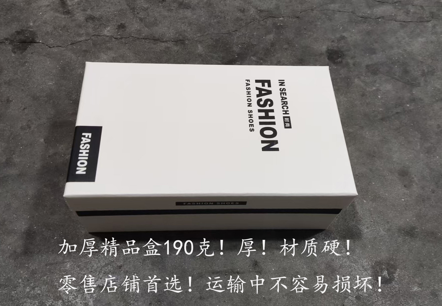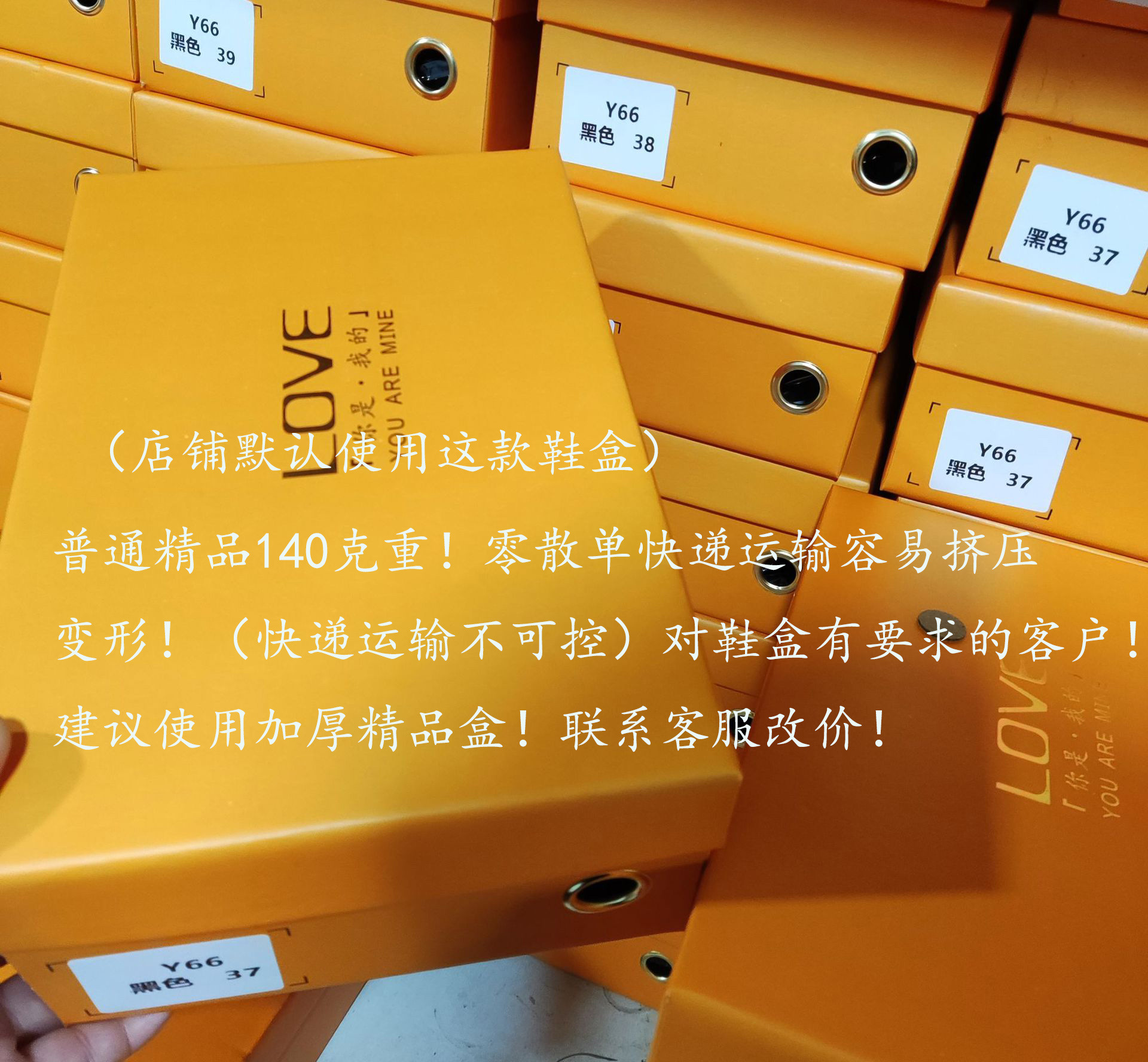 对鞋盒包装有要求的客户注意:零散单默认普通精品鞋盒使用快递袋包装,运输中造成的鞋盒挤压变形无法避免,对鞋盒外包装有要求联系客服改价使用精品加厚盒子每双+1元。或者5双起拍用纸箱打包可以基本杜绝掉鞋盒挤压的问题。(默认下单零散单客户,对鞋盒包装有要求,没有联系客服改价使用加厚精品鞋盒,运输中造成的鞋盒挤压变形,非质量问题,也不免费补发鞋盒!需要鞋盒可以联系客服支付鞋盒+运费进行补发)