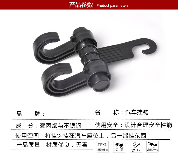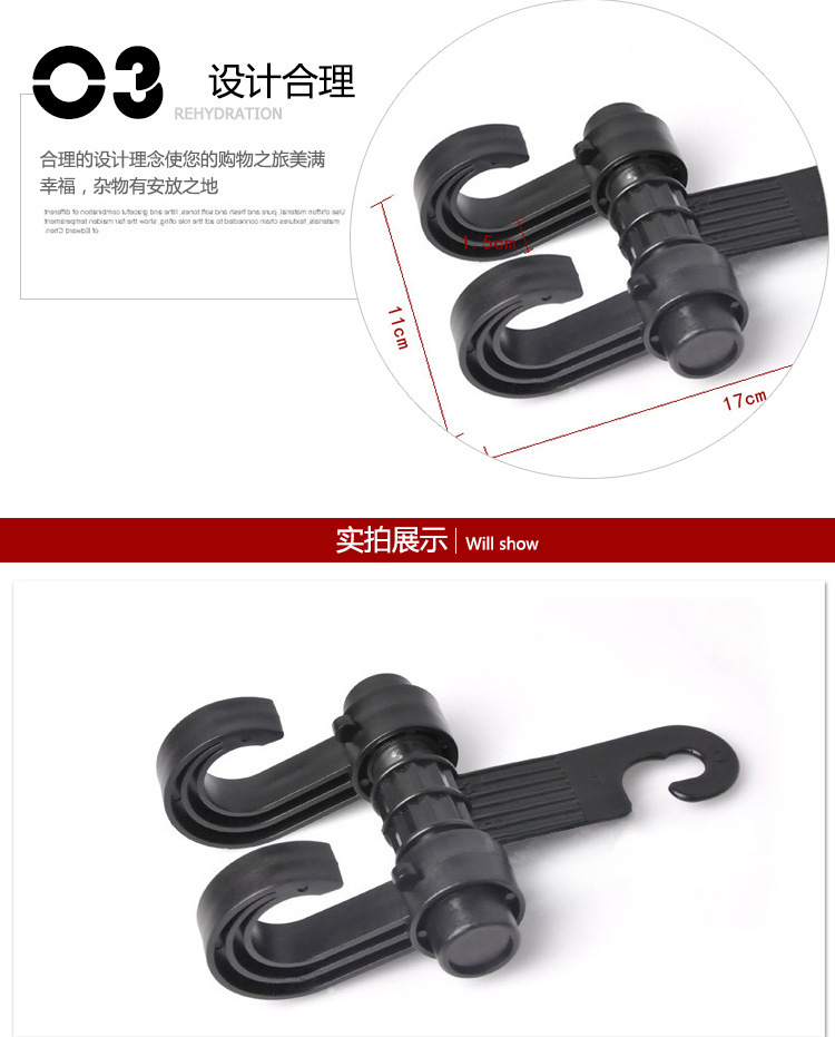 建议用途:将此挂钩一头钩在汽车座位上,另两个挂钩就可以挂置一些物品