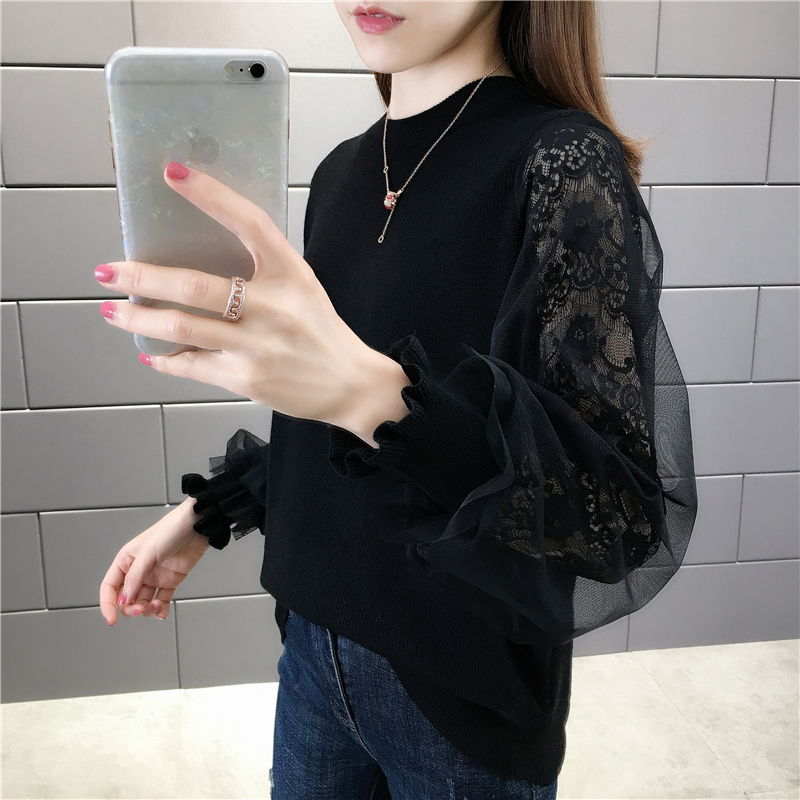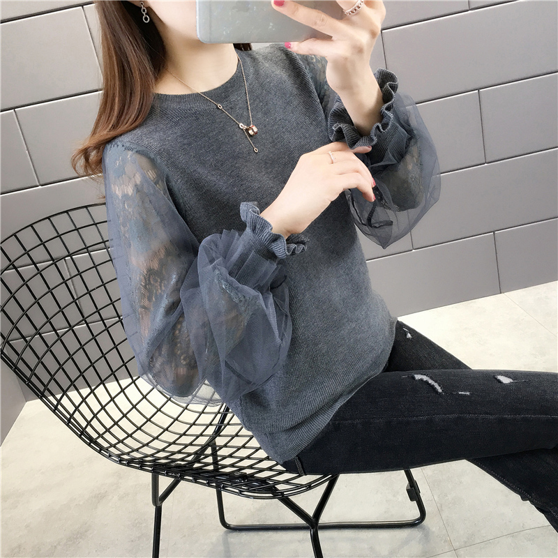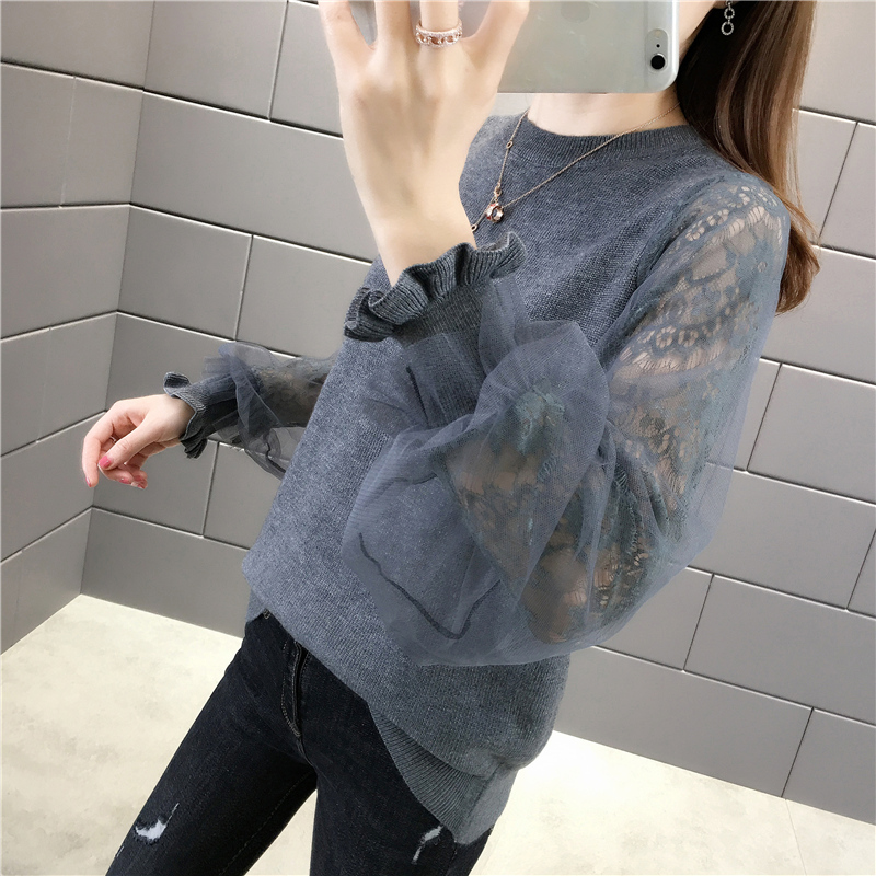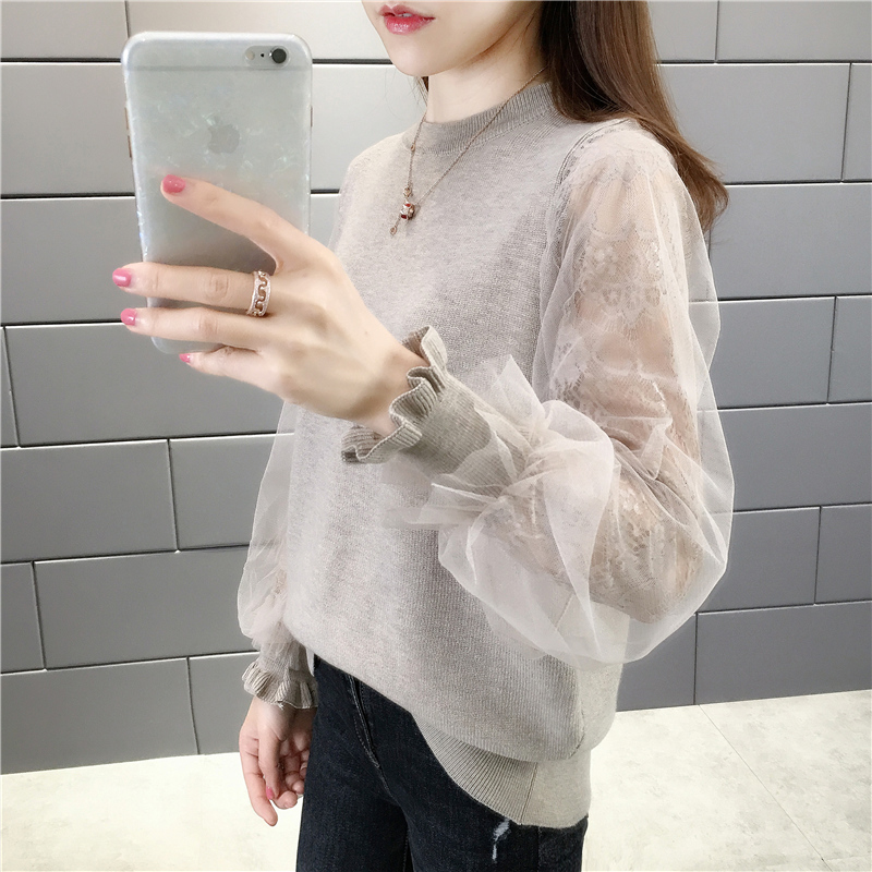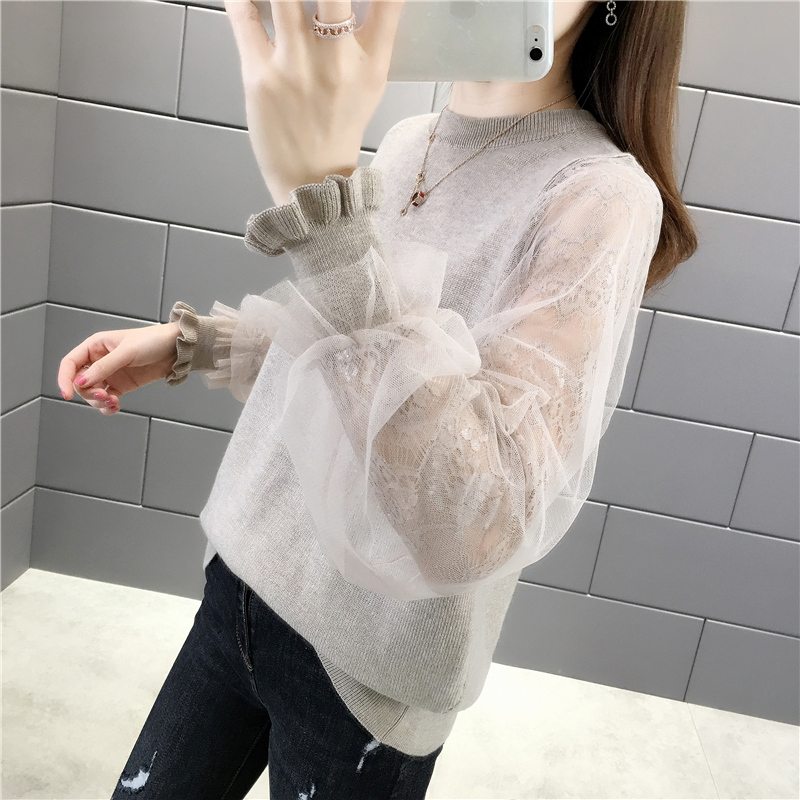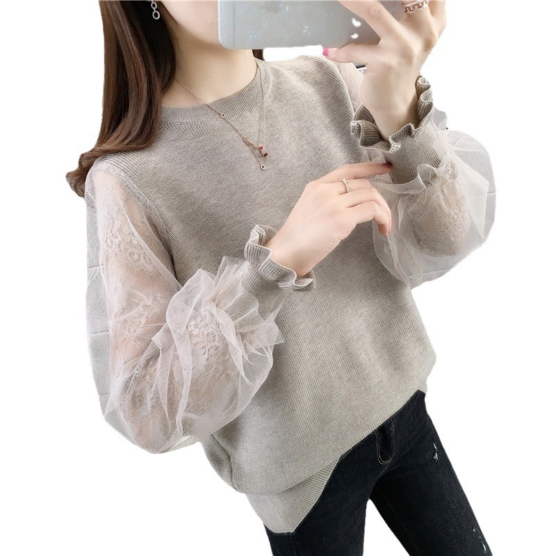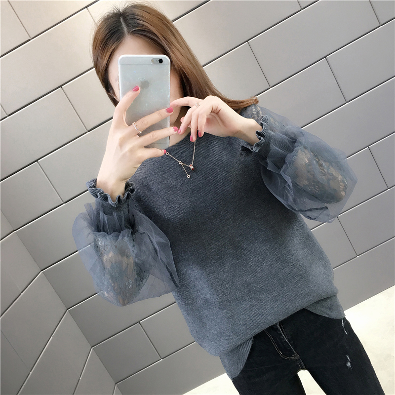 2021 весна и осень новая Корейская свободная кружевная вязаная Базовая рубашка с рукавами-фонариками, сетчатый студенческий свитер в стиле ретро, женская одежда