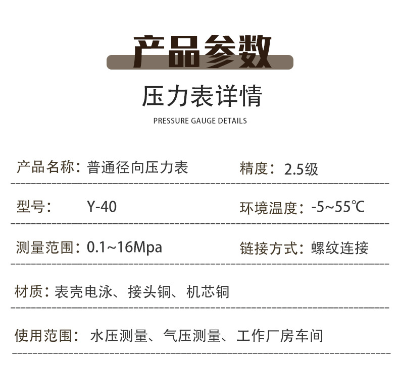 0.1Mpa; 0.2Mpa; 0.4Mpa; 0.6Mpa; 1Mpa; 1.6Mpa; 2.5Mpa; 4Mpa; 6Mpa; 10Mpa; 16Mpa; -0.1~0Mpa